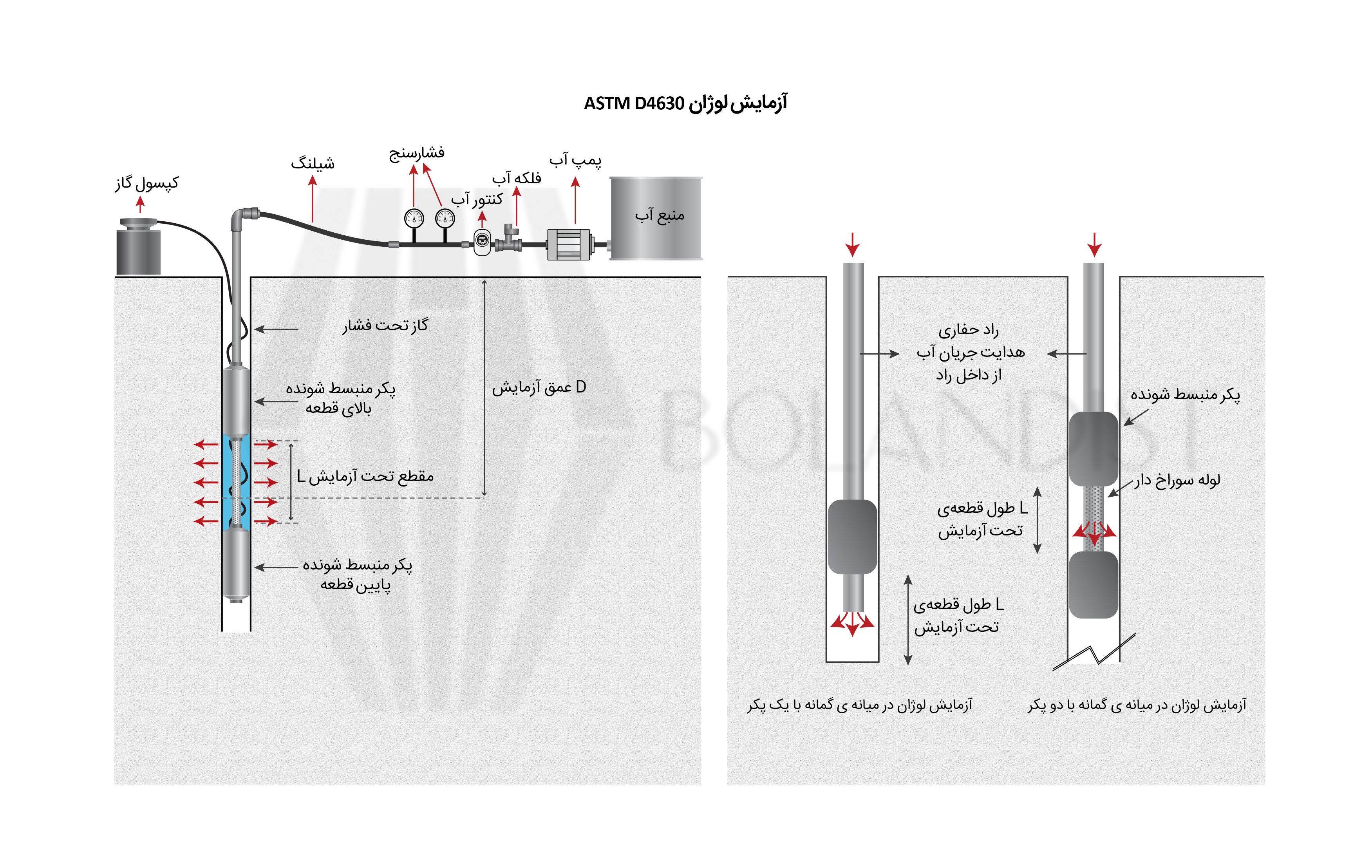 - نصب و اتصال صحیح تجهیزات آزمایش؛ از جمله مسدودکننده در بالا یا در دو سر قطعهی مورد آزمایش، فشارسنج، کنتور آب و غیره