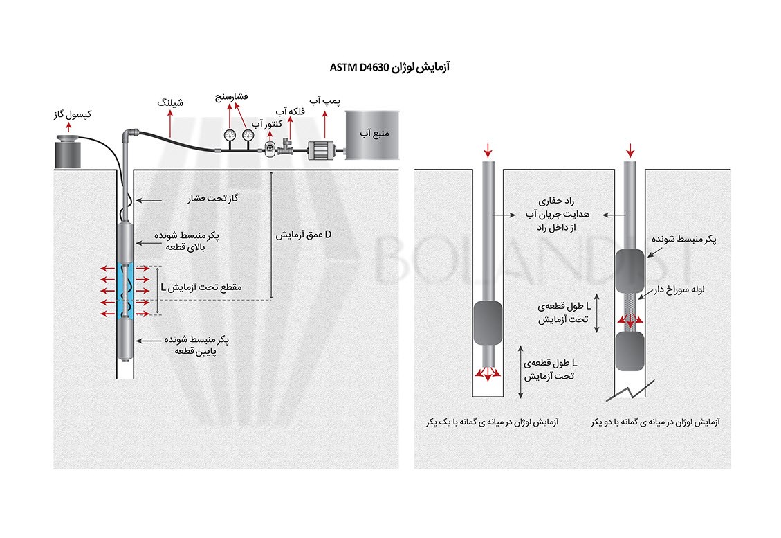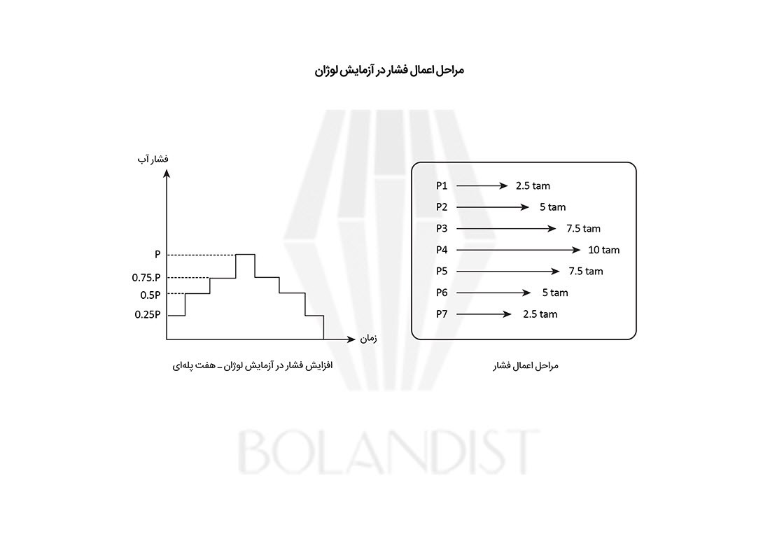 - شروع مراحل اعمال فشار؛ آزمایش لوژان معمولا 5 الی 7 پله با فشار مختلف دارد و برای هر پله یک عدد لوژان بدست میآید.